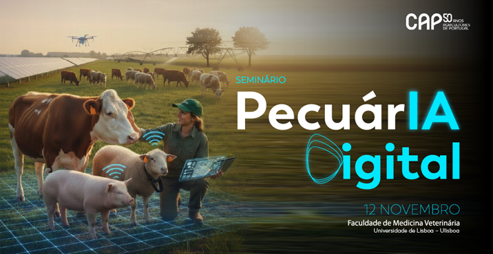 Temos o prazer de vos convidar para o Seminário "PecuárIA Digital", que se realizará no próximo dia 12 de novembro com início às 9h00, na Faculdade de Medicina Veterinária da Universidade de Lisboa (FMV-ULisboa), cujo programa pode consultar aqui: Programa_PecuárIA Digital.pdf