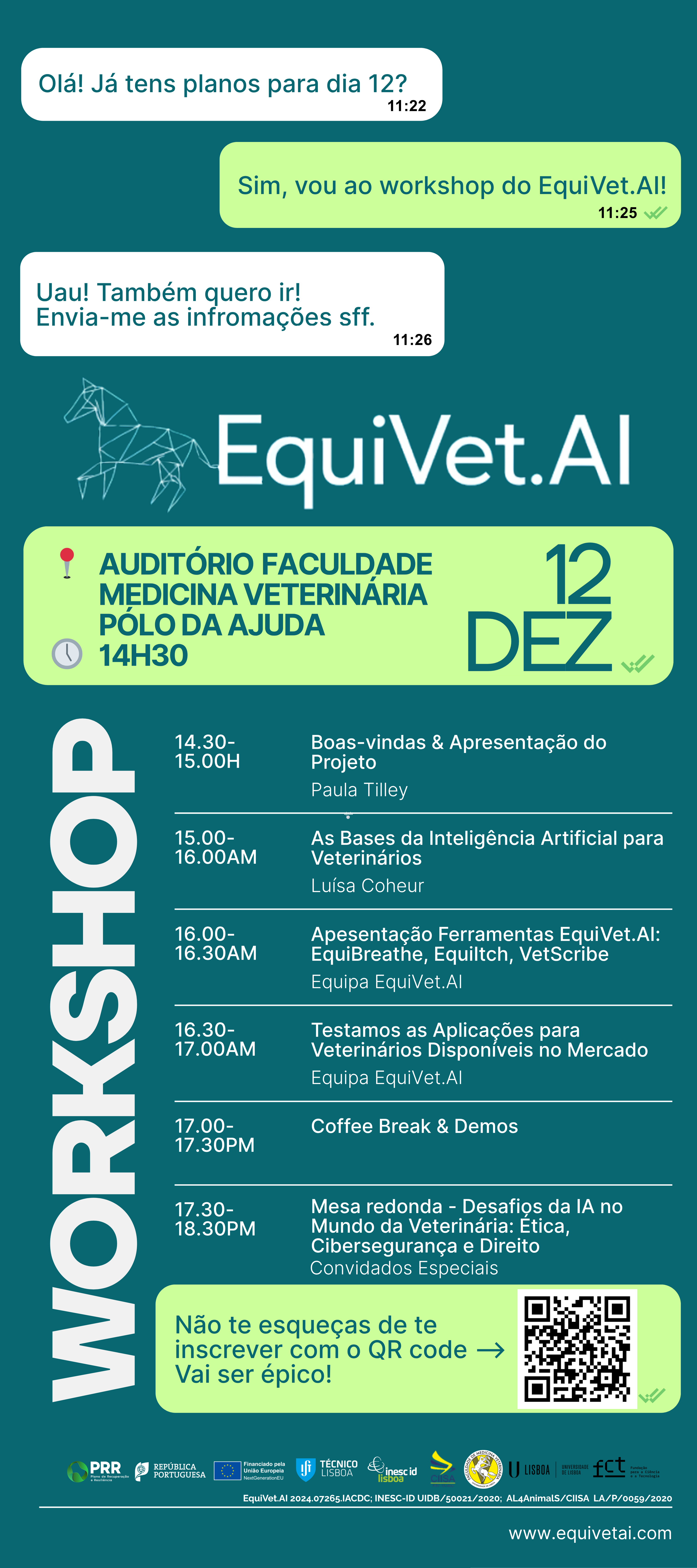 No dia 12 de Dezembro, a partir das 14:30 e até às 18:30, queríamos convidar todos os Médicos Veterinários, Alunos de Medicina Veterinária, Docentes e Investigadores para o Workshop do Projeto EquiVet.AI, o qual incluirá uma MESA REDONDA entre as 17:30 e as 18:30 com Convidados Especiais: